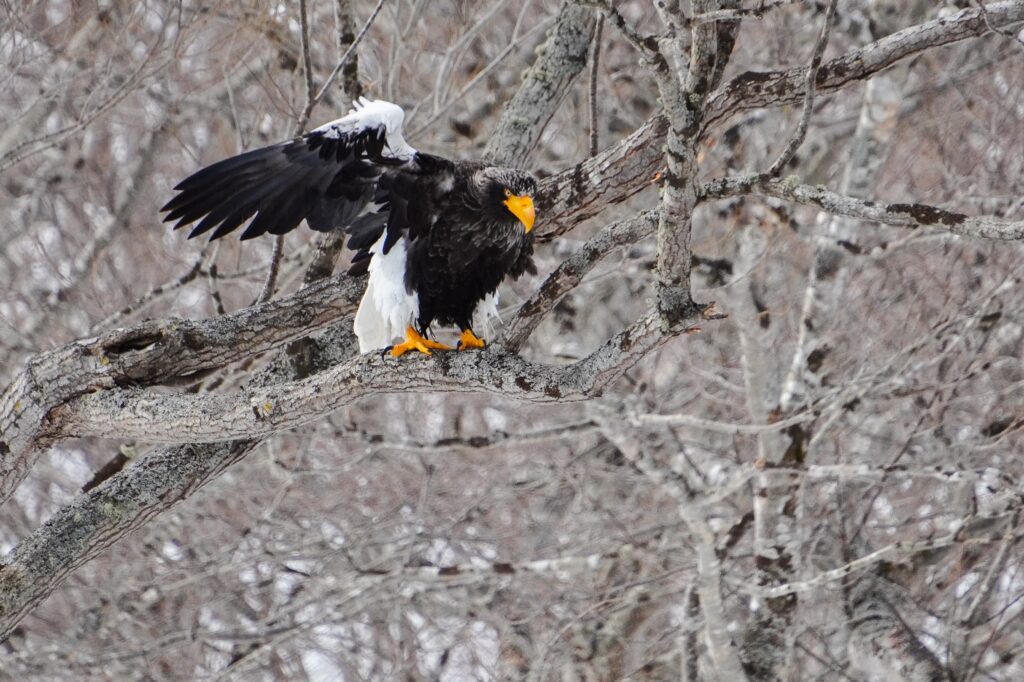 The following morning, the ice had vanished from the shore. In its place, a pod of sea lions was swimming, and the eagles had moved towards the land. My journey continued towards the Notsuke Peninsula.